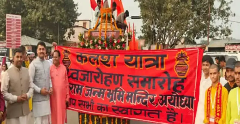राम मंदिर के ऐतिहासिक ध्वजारोहण समारोह से पहले Ayodhya में धार्मिक उत्साह अपने चरम पर है। समारोह की तैयारियों के बीच रविवार सुबह सरयू घाट से भव्य कलश यात्रा की शुरुआत हुई, जिसमें हजारों श्रद्धालुओं ने उत्साह और भक्ति के साथ हिस्सा लिया।