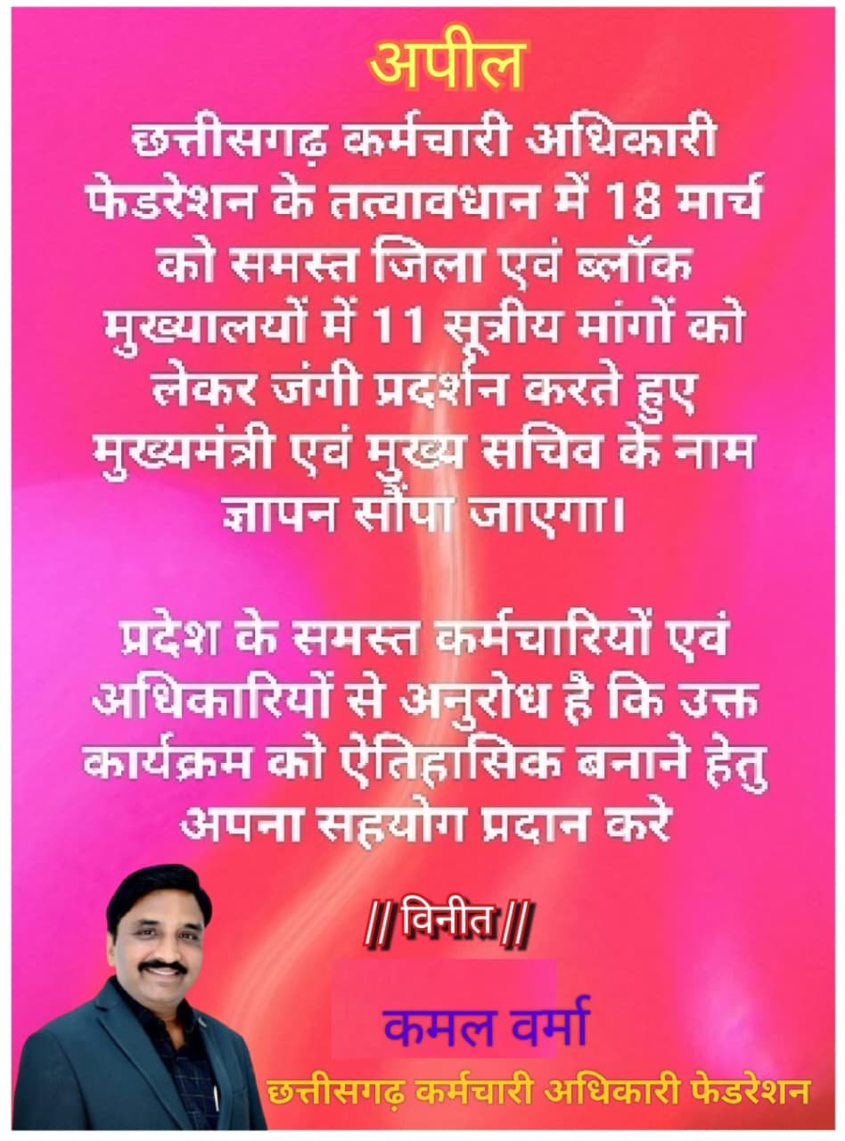 रायपुर, दिनांक — छत्तीसगढ़ कर्मचारी अधिकारी फेडरेशन के आह्वान पर प्रदेश भर के कर्मचारी एवं अधिकारी अपनी विभिन्न लंबित मांगों को लेकर 18 मार्च 2026 (बुधवार) को जिला एवं ब्लॉक मुख्यालयों में भोजन अवकाश के दौरान जंगी प्रदर्शन करेंगे। फेडरेशन ने प्रदेश के सभी कर्मचारी-अधिकारियों से अधिक से अधिक संख्या में शामिल होकर अपनी एकता और अधिकारों की आवाज बुलंद करने का आह्वान किया है।