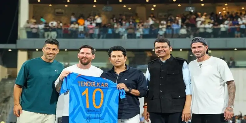 Sachin Tendulkar-Lionel Messi: लियोनल मेसी अपने भारत दौरे के दूसरे दिन मुंबई गए थे, जहां वानखेड़े स्टेडियम में कई प्रमुख हस्तियों से मुलाकात की। इस दौरान उनके साथ फुटबॉलर लुइस सुआरेज और रोड्रिगो डी पॉल भी थे। मेसी के साथ स्टेडियम में क्रिकेट के दिग्गज सचिन तेंदुलकर, महाराष्ट्र के मुख्यमंत्री देवेंद्र फडणवीस, भारतीय फुटबॉल के दिग्गज सुनील छेत्री, अभिनेता अजय देवगन और टाइगर श्रॉफ समेत कई अन्य हस्तियों ने इस कार्यक्रम की शोभा बढ़ाई। फुटबॉल फैंस भी भारी तादाद में मेसी की एक झलक पाने के लिए ग्राउंड में पहुंचे थे और मेसी-मेसी के नारे लगा रहे थे।